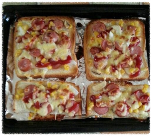 토마토소스, 옥수수 치즈를 듬뿍 올려 오븐에 구운 식빵 피자자도 좋지만,