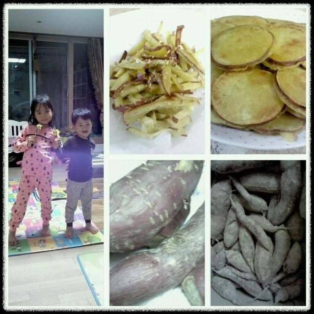 유치원 다녀오자마자 아이들과 찐 고구마, 고구마 채 맛탕, 고구마튀김을 만들어