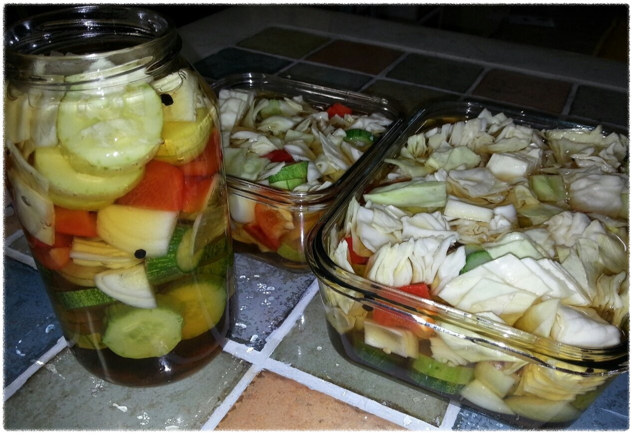 식초와 설탕 물을 1:1:1 비율로 넣고 약간의 소금을 넣어 한소끔 팔팔 끓인 후 뜨거울 때 썰어놓은 야채에 부어 밤새 식혔다가 아침에 냉장고에 넣으면 따로 오래 숙성하지 않아도 바로 먹을 수 있는 피클완성이다.