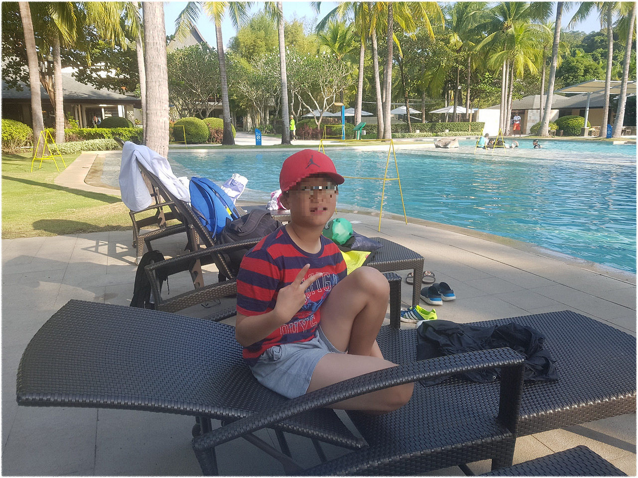 우리 아들은 열이 안 떨어져 물놀이는 못하고 썬베드에 쭈그려 앉아 구경하고 있는 사진도 보내왔다.