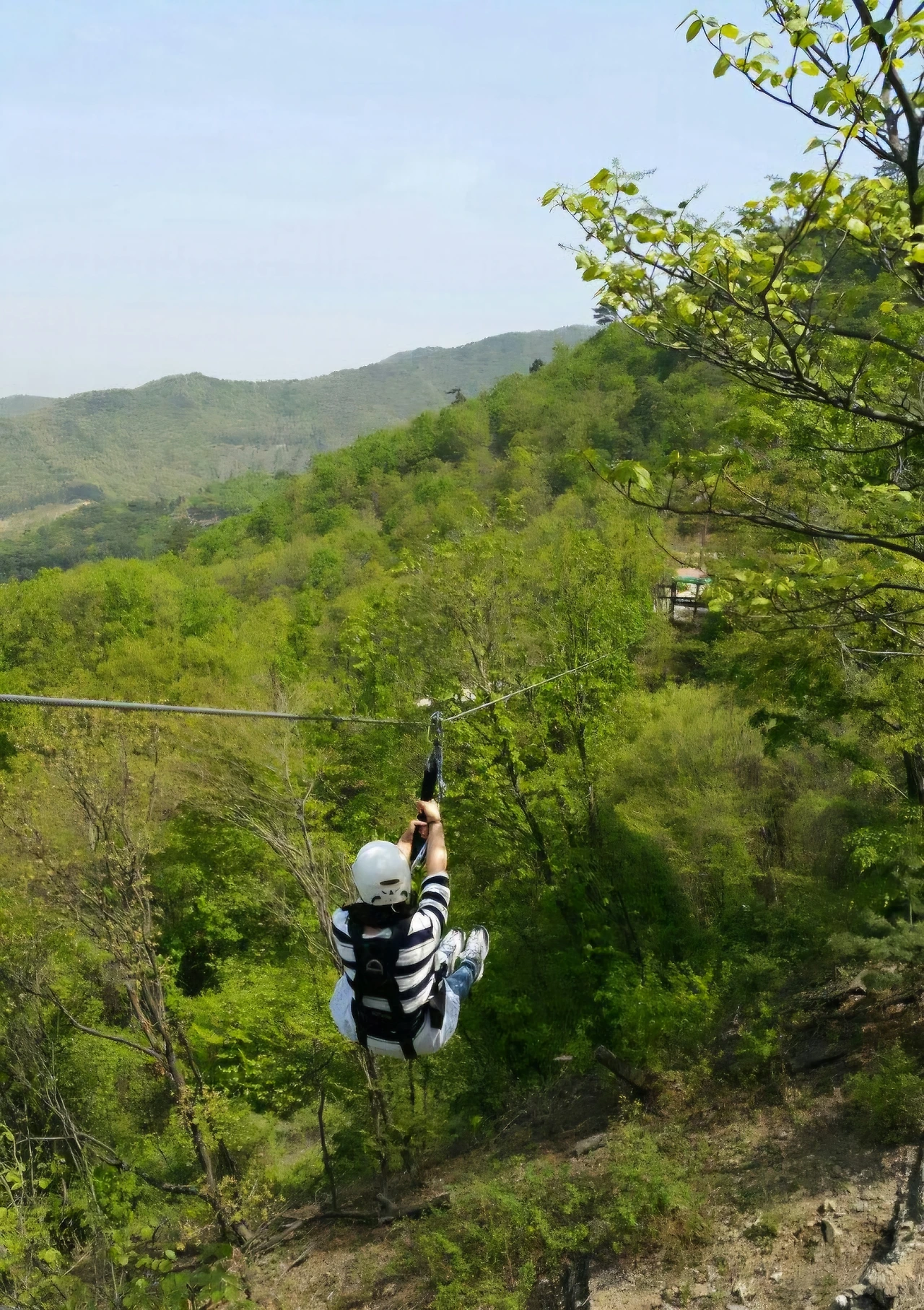 산꼭대기에서 와이어에 의존해 내려오는 짚라인 도전