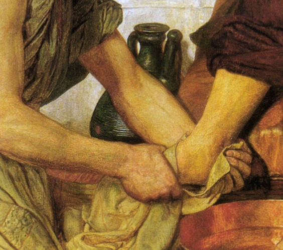 “저녁 잡수시던 자리에서 일어나 겉옷을 벗고 수건을 가져다가 허리에 두르시고 이에 대야에 물을 떠서 제자들의 발을 씻으시고 그 두르신 수건으로 닦기를 시작하여” (요한복음 13:4-5)