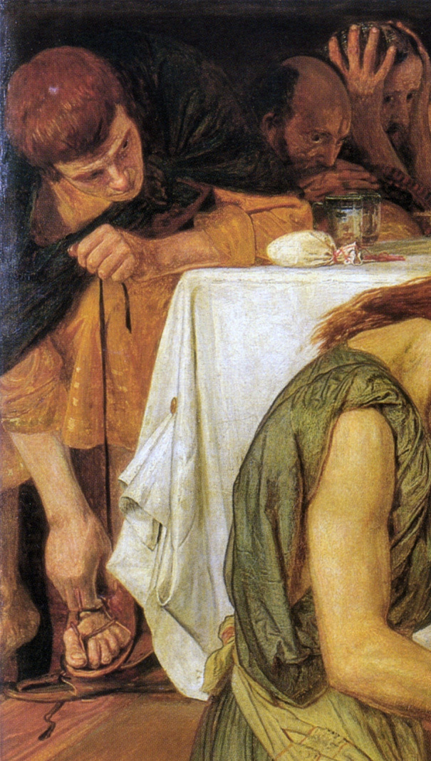 이번에는 만찬 후에 예수를 은 삼십 냥에 팔아넘기는 가롯 유다를 보겠습니다. 뒤에서 다음 차례를 기다리는 제자들이 보이죠? 맨 왼쪽에 있는 제자가 오른쪽 샌들끈은 이미 풀었고 지금 왼쪽 샌들 끈을 풀고 있습니다.
