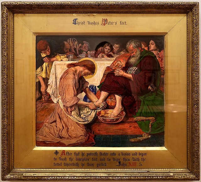 기록대로 이 분이 하나님이신 것을 후광으로 표현했습니다. 그리고 성경 기록대로 표현되어 있어 이 분이 주님이신 것을 알게 합니다. 제가 왜 구절의 기록을 알려드렸는가 하면요. 화가는 최대한 당시 실제 행했던 세족식 기록대로 그렸기 때문입니다. 실제 기록과 이 그림을 비교해 보십시오.