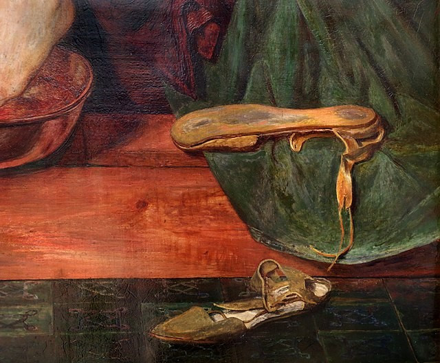 그런데 그에게서 특이한 표현을 보게 됩니다. 왼손에 검은 샌들 줄이 수직으로 잡혀 있죠? 이렇게 신발을 풀고 있는 사람은 업죠? 많은 중세 명화를 살펴봤지만 이렇게 수직으로 줄을 잡고 있는 표현은 매우 특이합니다. 이 수직의 검은 줄을 어떻게 해석해야 할까요?