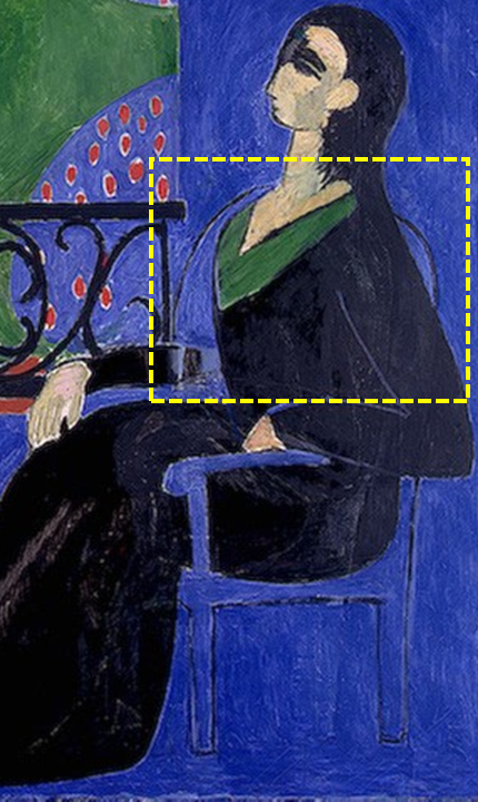 우선 의자가 이런 상황을 잘 보여줍니다. 의자의 등 부분을 보면 관객을 향하고 있죠? 노란 점선안을 보면 의자의 등 부분이 보입니다. 이 부분을 보면 의자의 등이 관객이 있는 정면을 향하고 있습니다. 그런데 여성은 옆으로 앉아있죠? 아래 다리 부분은 옆으로 향하고 있습니다. 즉 모순된 시대 아래에서 살아가는 여성의 상황입니다.