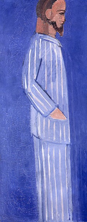 남자와 여자를 선으로 표현했는데요. 먼저 남자를 보겠습니다. 잠옷에 “나는 강직한 남자”라는 듯이 온통 직선이 보입니다. 아래위 옷은 말할것없고 목에도 강한 선을 넣어 뻣뻣이 서있는 그의 마음을 대변합니다. 그의 얼굴에 난 수염도 뭔가를 찌를듯이 뽀족하며 얼굴 앞면과 함께 이 역시 직선을 이룹니다.