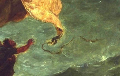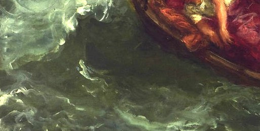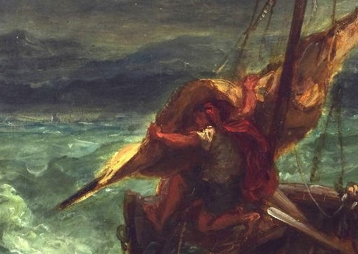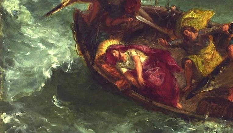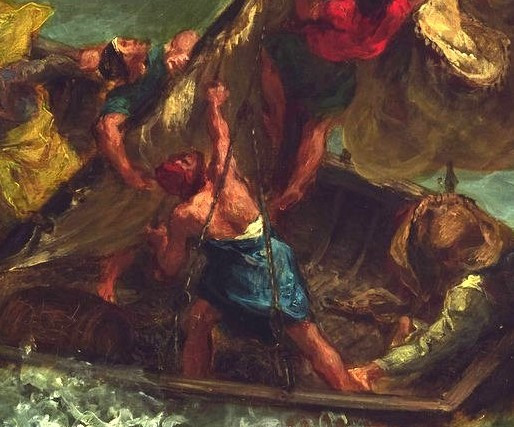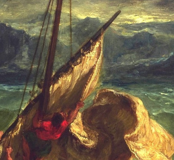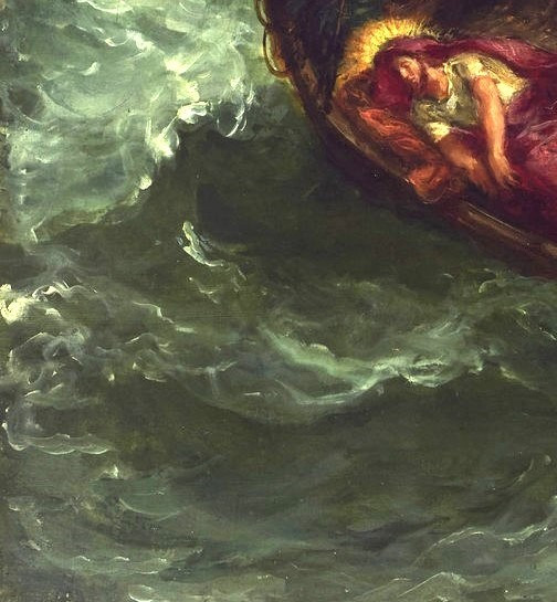 지금 파도가 광풍과 함께 배로 몰아쳐서 뒤집히기 일보직전인 상황이다. 얼마나 깊이 잠드셨는지 두 손을 앞으로 모으고 계시는데 미동이 없으시다. 파도와 완전히 대조되는 표현으로 이 작품 속에서 빛나는 창의적 표현이다. 작품 안에서 이렇게 따로 화폭을 잘라 보는 습관은 작품을 더 깊이 있게 들여다보게 한다.