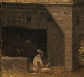 전체 그림에서 볼 때 노인의 크기가 작고 평범한 인물로 보입니다. 이런 이유로 대부분의 관객들은 이 노인에 대해서 큰 관심을 갖지 않을 것 같습니다. 그렇지만, 이 노인은 특별한 특징을 지니고 있는데요. 그가 앉은 자세와 바라보는 방향입니다. 그의 시선의 방향이 예수 탄생 이전 시기인 과거를 바라보고 있고, 흰색 천 위에 앉아있는 것은 의도적인 모습입니다.