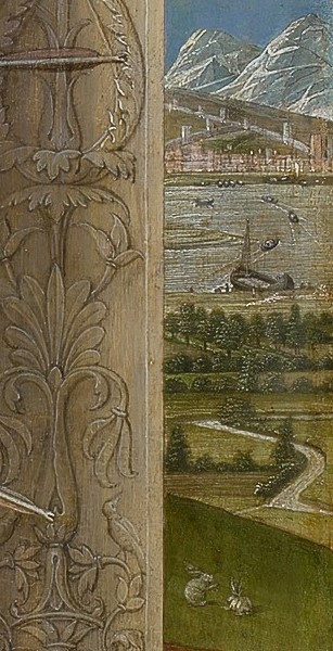 좋은 상징도 있는데요. 뒷다리의 힘으로 높은 곳으로 잘 뛰어 올라가죠? 열심 있는 믿음이나 신앙을 상징합니다. 토끼가 등장한 것은 세바스챤의 죽음을 넘어선 순교의 상징으로 해석합니다. 이렇게 양쪽에 토끼가 있는 것은 푸른 초원이나 거친 돌밭이나 한결같은 신앙을 의미합니다. 그런데요 이 작품에는 한 가지 놀라운 반전이 있습니다. 들판의 토끼는 화살의 각도와 깊은 연관이 있습니다. 의아스럽죠? 토끼와 화살의 각도에 대해서 살펴보며 그림여행을 마치겠습니다.