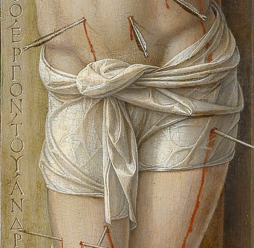 우선 사람의 몸입니다. 표현이야 조각 같아 보이지만 화살이 뚫고 들어가 피를 흘리는 것을 보면 말랑말랑한 피부가 감지되고, 흘러내리는 피의 온도가 감지됩니다. 고통으로 얼룩져 땀이 베인 하체의 흰색천 재질도 잘 표현되었는데, 그 위에 피가 스며든 표현도 손끝에서 느낄 수 있습니다.