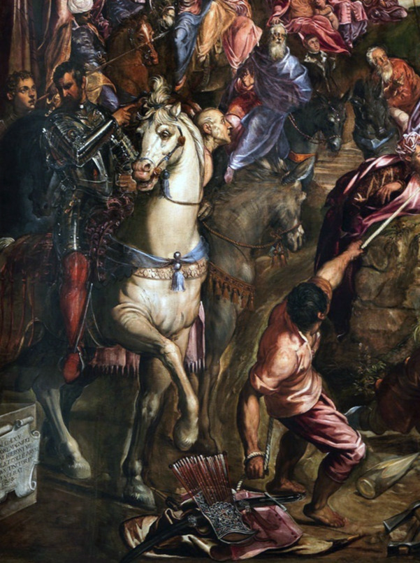 시선을 앞쪽으로 옮기면 일반인과 부유층 사람들이 자리해 처형장으로 시선을 던지고 있습니다. 개중에는 어린아이까지 함께 있는 가족도 보입니다. 맨 앞쪽에는 화려한 장식을 한 백마와 갑옷을 입은 한 사내를 발견합니다. 왼손으로 예수를 가르키며 무엇인가 지시를 내리는 중입니다. 과연 이 남성은 누구일까요?