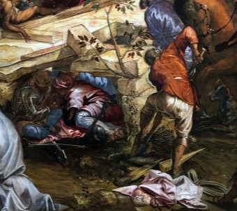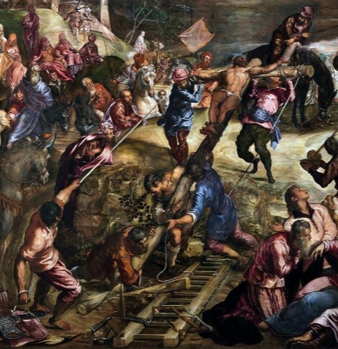 이 작품이 뿜어내는 힘인데요. 화가 틴토레토가 습득했던 미켈란젤로의 드로잉과 티치아노의 감각적인 채색의 효과를 자신의 것으로 만든 결과입니다.