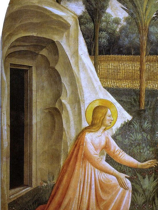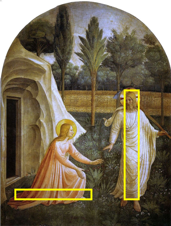 화가는 이 만남을 수직과 수평의 구도로 시각화 했는데요. 마리아는 땅에 몸을 낮춘 수평적인 자세로 인간적인 애착을 보이고, 예수님은 똑바로 선 수직적인 자세로 하늘에 근간을 둔 소명과 부활의 권위를 보여줍니다. 이 땅과 하늘, 두 차원의 시각적 대비야말로 이 그림이 전하는 가장 중요한 메시지입니다.