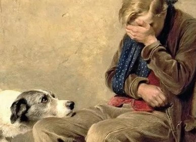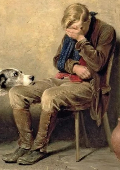 이 작품에서도 그런데요. 그는 화려한 기교 대신 배경을 단순화하여 관객이 인물과 동물 사이의 정서적 교감에만 집중하게 만듭니다. 구석에서 부러진 팔을 감싸 쥔 채 얼굴을 가린 남자와, 그런 주인의 무릎에 머리를 올리고 위로의 시선을 던지는 개의 모습은 보는 이로 하여금, "과연 이들에게 무슨 일이 있었을까?"라는 질문을 던지게 합니다.