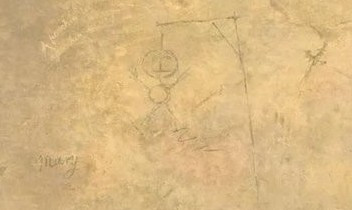 교수대에 매달린 이 기묘한 낙서를 자세히 들여다보십시요. 얼굴에 해당하는 원 안의 형상은 얼핏 영어 이니셜 'I'처럼 보이기도 하고, 죽은 자의 이목구비를 짧은 선으로 단순화해 묘사한 전형적인 죽음의 상징으로도 읽힙니다. (눈의 형상이지만 영어 I(아이)로 보일 수 있습니다.)
