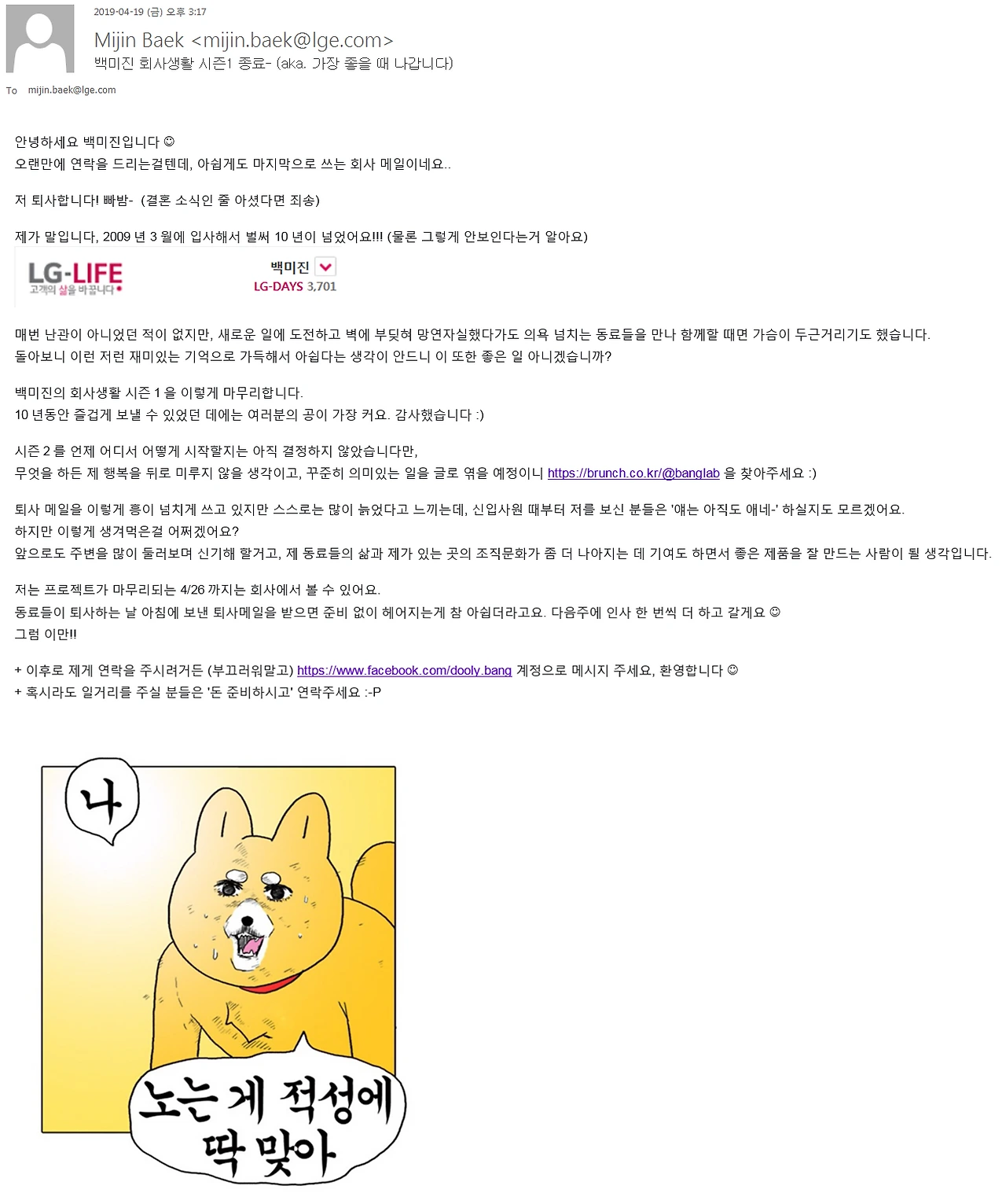 간혹 동료들이 퇴사한다며 당일날 오후쯤 메일을 보내오는데, 그런 연락을 받으면 인사도 제대로 못 하고 보내는 게 늘 아쉬워서 나는 일주일 전에 동료들에게 나간다는 메일을 보냈다.