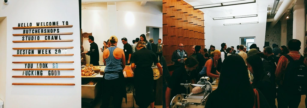 샵 이름이 푸줏간집이라서 그런지 케이터링이 각종 소시지였다. 디자이너들이 네트워킹하고, 내가 뭘 하는 사람인지 어필하며 기회를 찾는 시간. 한 친구가 다가와 자신의 티셔츠를 가리키며 어제 만든 사이트라고 소개했다.