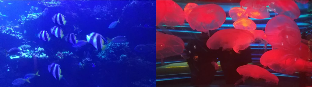 어항 속 하나 가득 해파리만 들어있는 곳도 있었는데 LED를 다양한 색상으로 켜두니 굉장히 예뻤다.