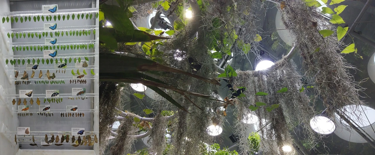 나뭇잎으로 번데기를 감싸서 저렇게 붙여두면 나비가 되어 빠져나와 뮤지엄 안을 날아다닌다. 돔 안에는 나비가 날아다니고, 잠시 앉을 수 있도록 오렌지 등을 곳곳에 놔두었다. 사람들과 나비가 한 공간에 조화롭게 있는 것이 참 좋아 보였다.