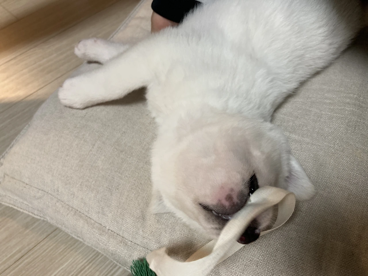 이제 더 확실해졌는데, 배 보이고 누워서 입 아 벌리고 도리도리 하고 내 손을 무는건 졸려울 때 하는 표현같다. 저러다가 2분 후에 잠듦..