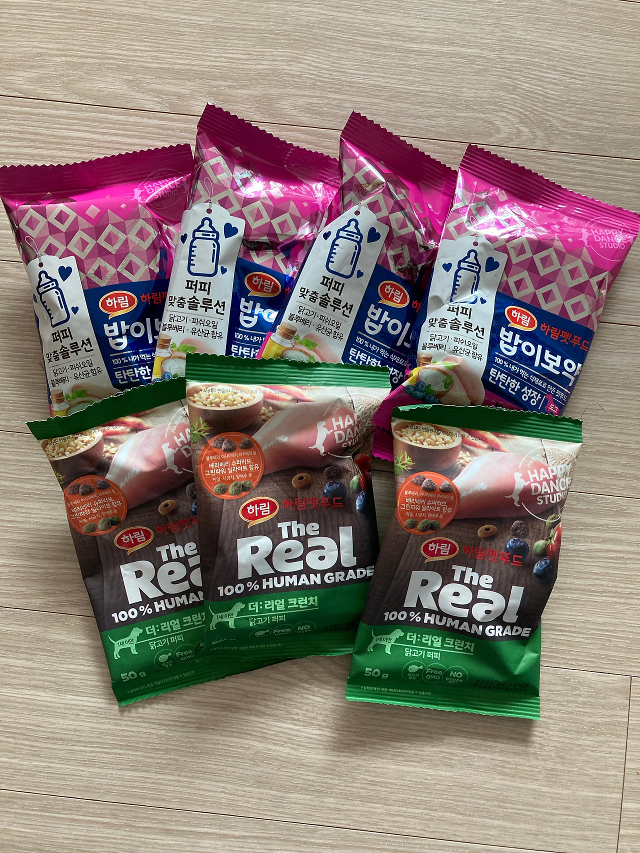 밥이 보약 DOG 탄탄한 성장 (50g * 4), 더 리얼 크런치 닭고기 퍼피 (50g * 3) 각각이 5천원이다. 하림이 맨 처음 샘플 사료를 주문해본데다 고를 수 있는 사료가 많아서 괜히 택배비 내면서 한 가지를 더 주문해봄