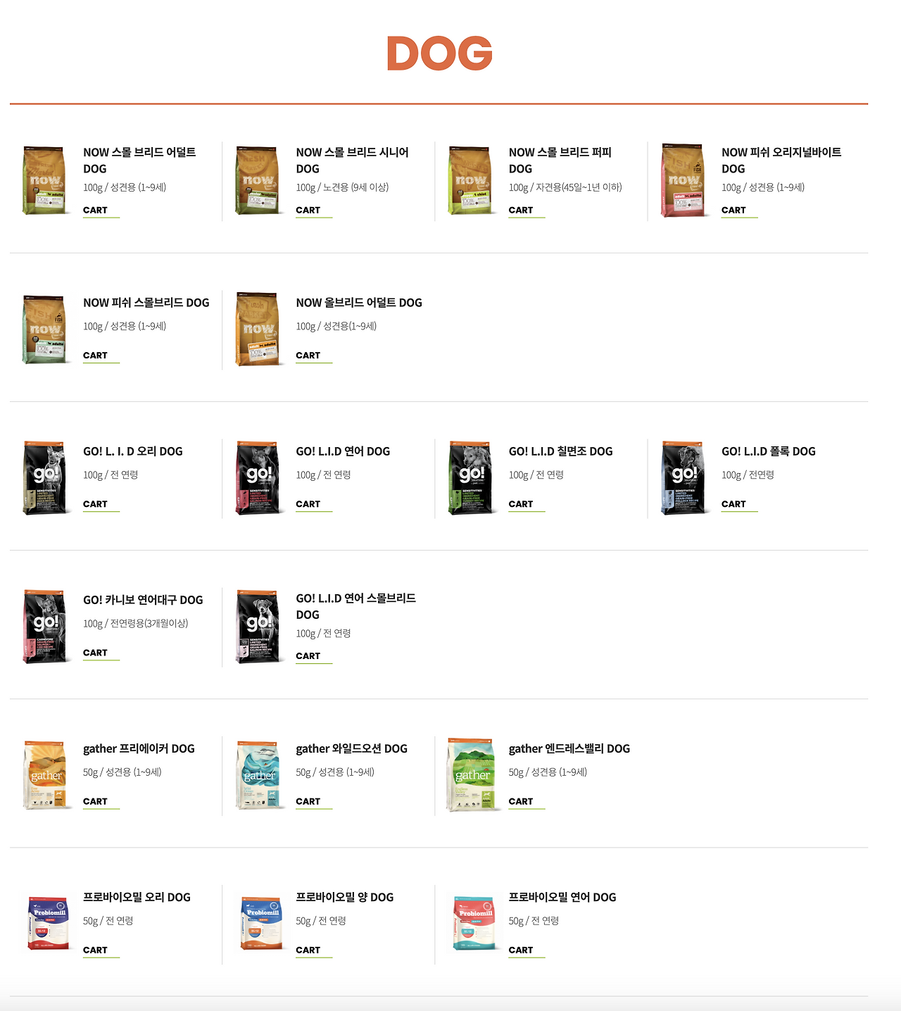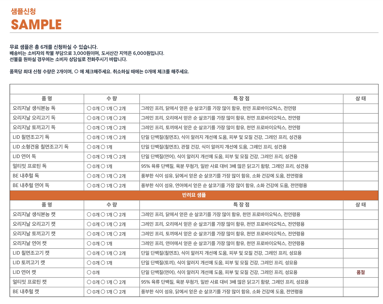 샘플 신청 시 반려동물 종과 개월수를 입력하게 되어있고, 그에 맞춰서 샘플을 보내준다.