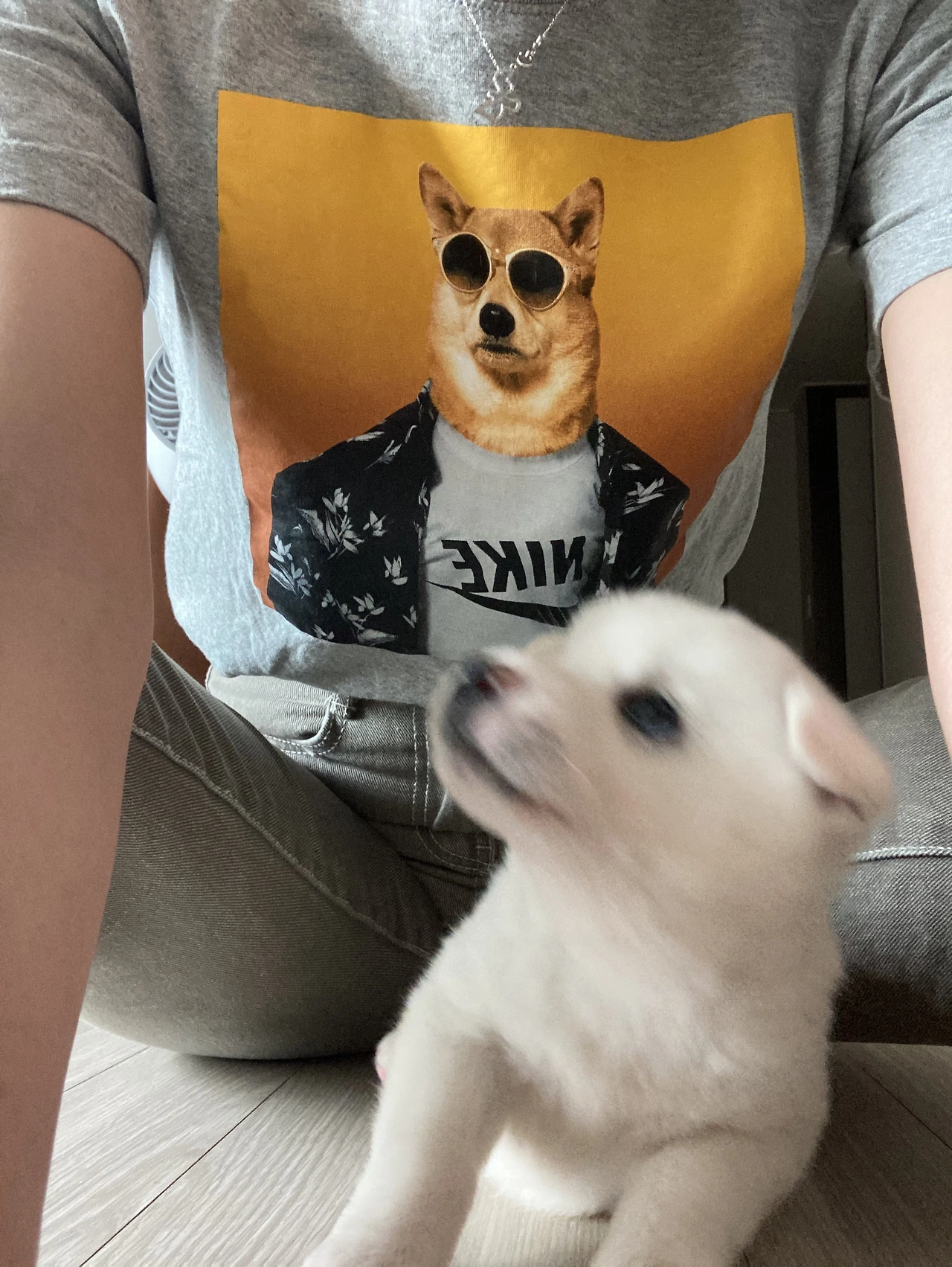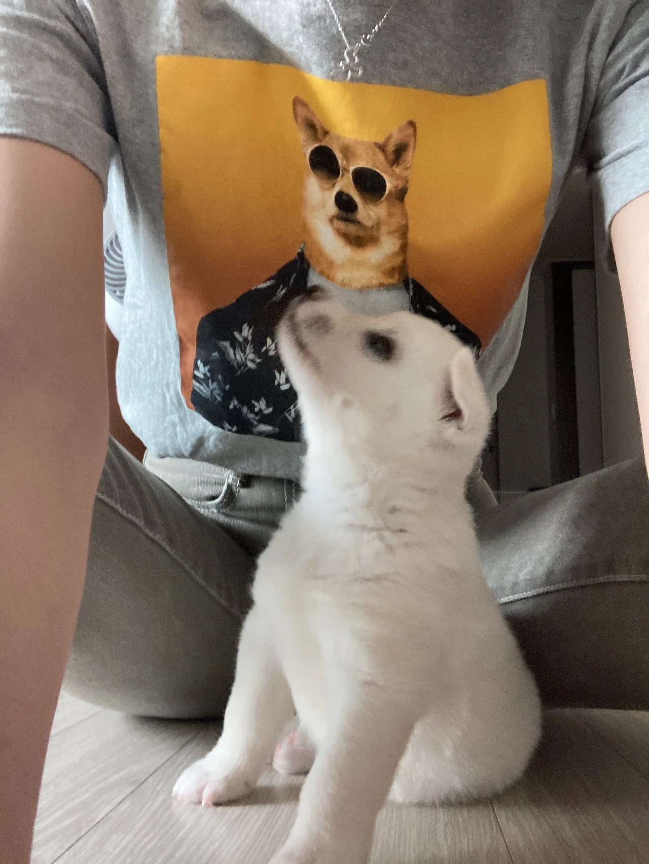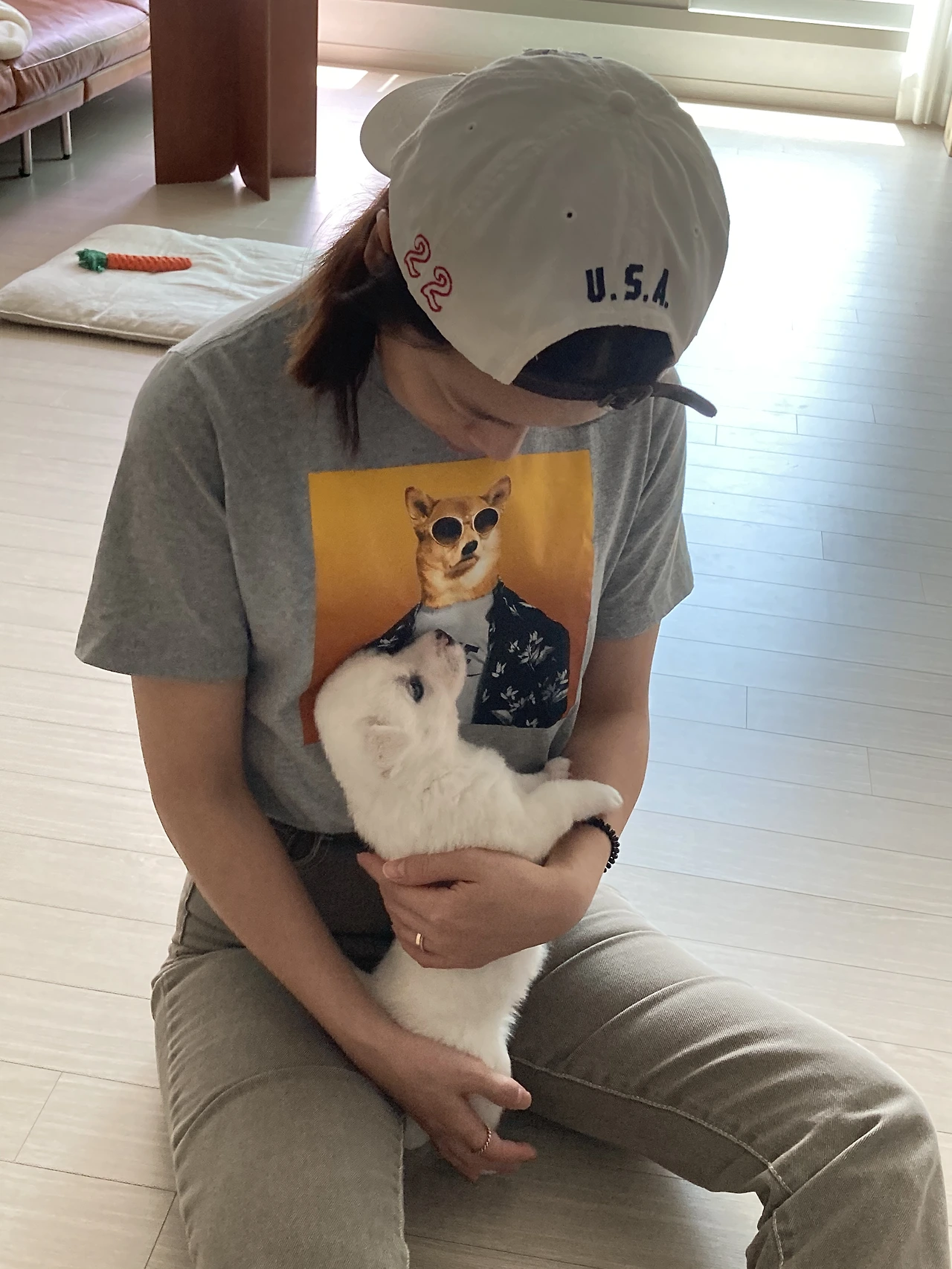나도 점심 시간이라 밥 먹고 잠깐 놀아주기. 오늘 때마침 개엄마 티셔츠를 입었지.