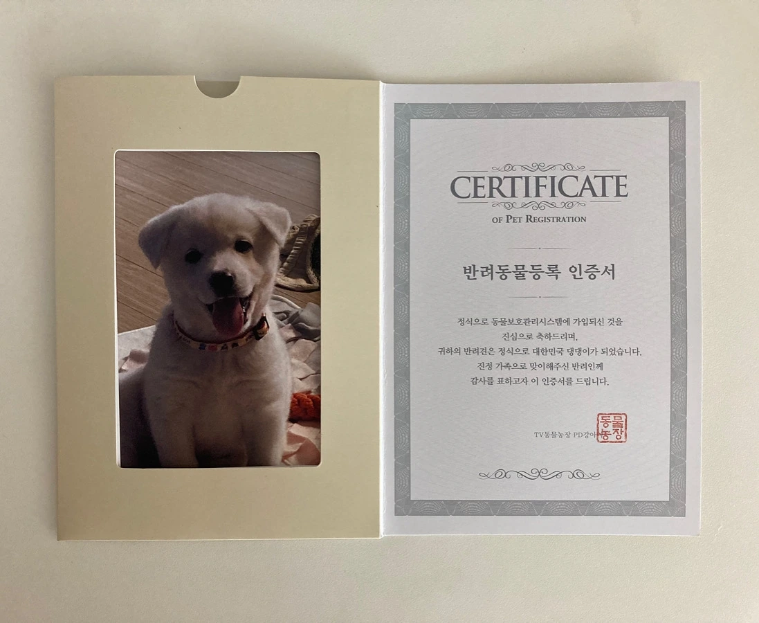 그래서 와이펫에서 보내준 외장 칩, 동물등록 인증서, 반려동물등록증(강아지 민증), 문패, 건강 수첩이다.