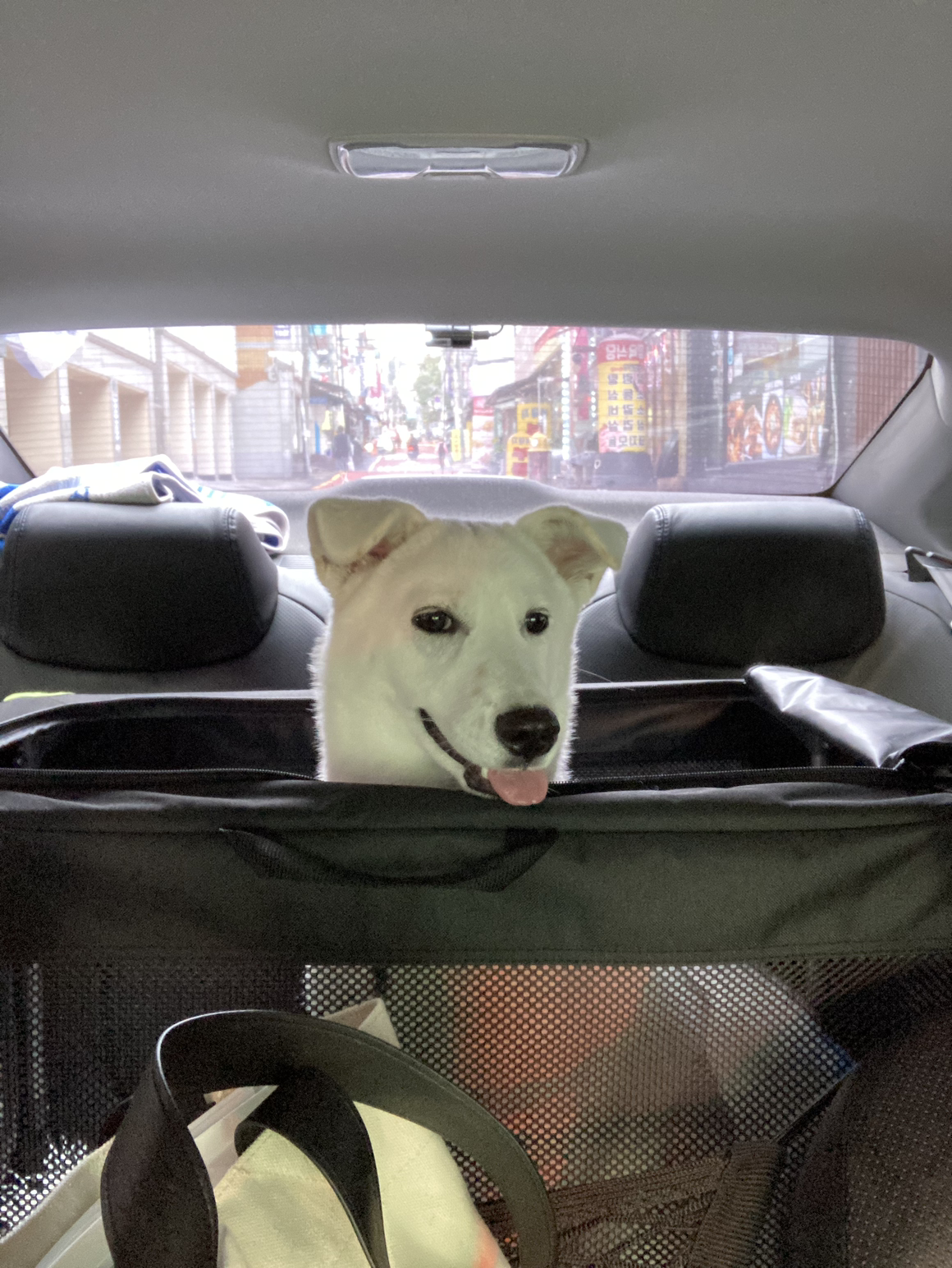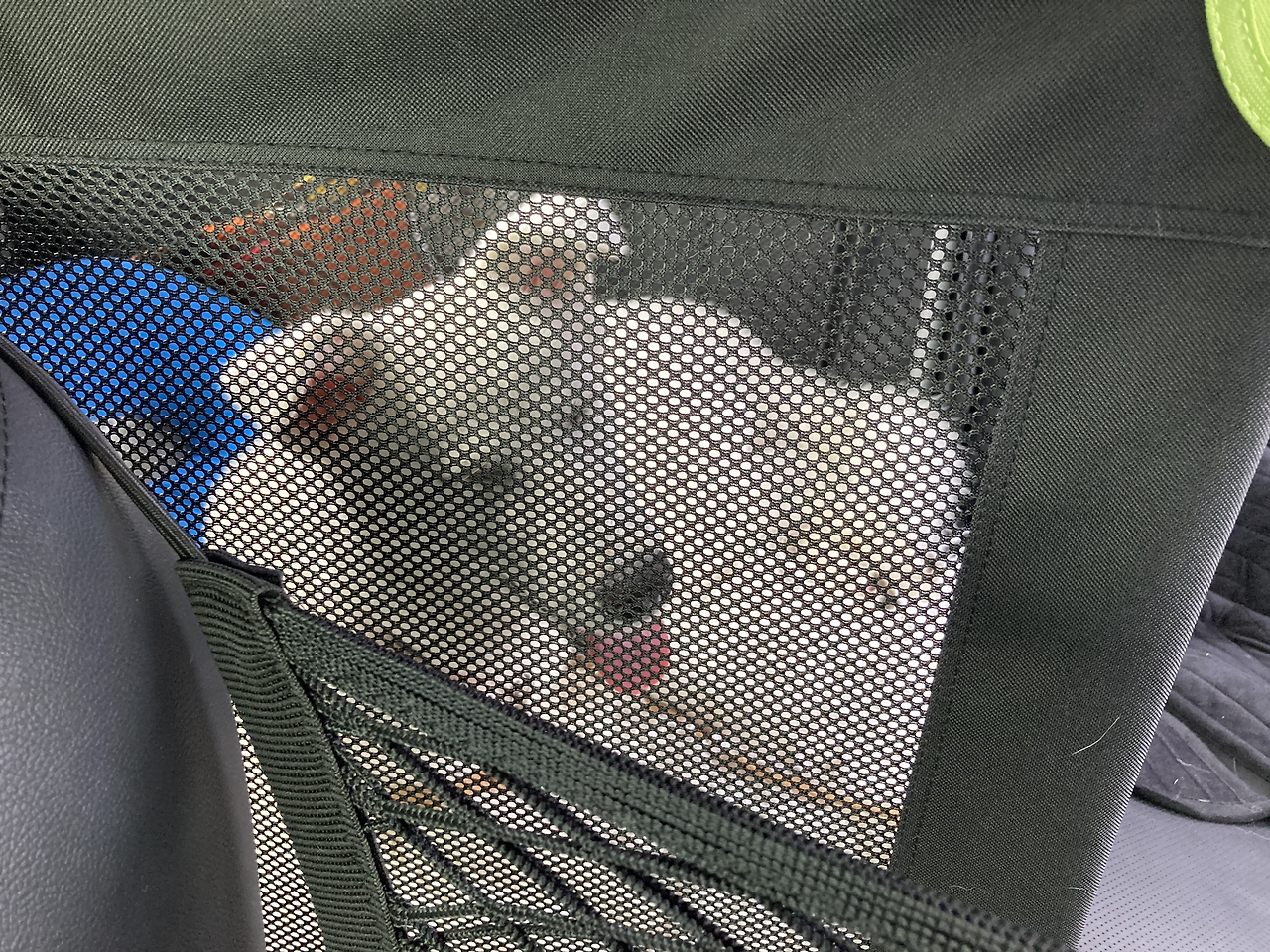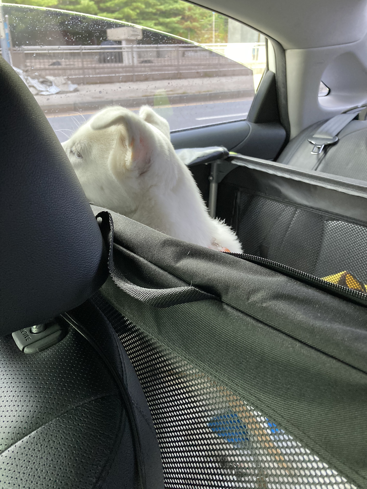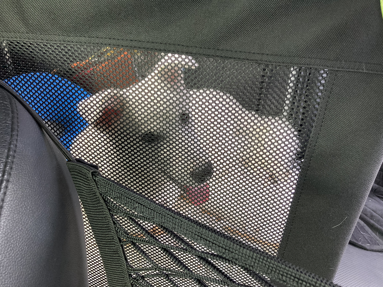 이전까진 뒷좌석에 미끄럼 방지 시트를 깔고 앉혔었는데, 좌석에 그냥 두니까 서있다가 바닥에 떨어질 때가 있어서 하우스 훈련하려고 뒀던 소프트 켄넬을 내 차 뒷좌석에 설치했다.