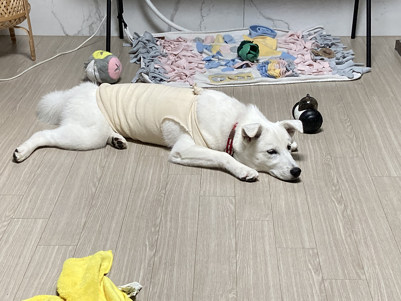 실밥 풀고 나서는 아침, 저녁에 단지를 도는 중인데 아무래도 사월이가 원하는 만큼 돌아다니질 못하니 지루한 모양이다. 집에서 장난감 가지고 던지며 놀아주는 것도 안 하고 있어서 좀 짠하기도 하다.