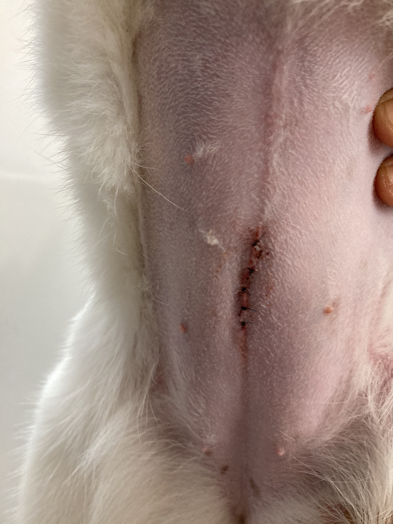 다음날 드레싱 하러 병원 가서 붕대를 풀러 보니 상처는 이 정도. 소형견 상처는 더 작던데 얜 중형견이니까..