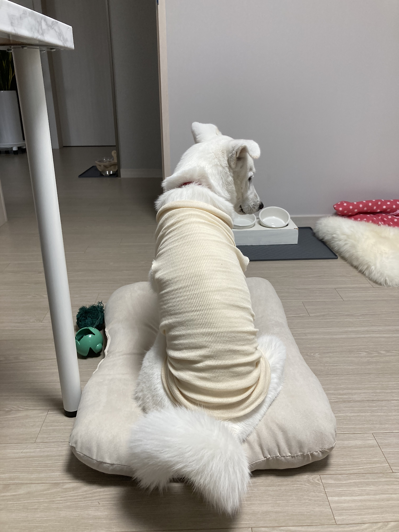중형견 아가들은 움직임이 커서 내복은 곧 오프숄더가 되어버려서 늘어난 목 부분을 뒤로 당겨 쫌매줌.