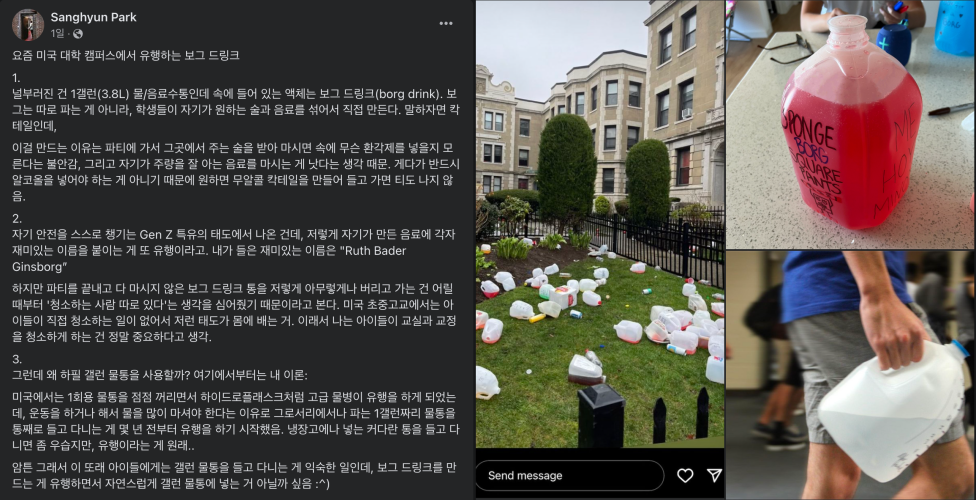 "하지만 파티를 끝내고 다 마시지 않은 보그 드링크 통을 저렇게 아무렇게나 버리고 가는 건 어릴 때부터 '청소하는 사람 따로 있다'는 생각을 심어줬기 때문이라고 본다. 미국 초중고교에서는 아이들이 직접 청소하는 일이 없어서 저런 태도가 몸에 배는 거. 이래서 나는 아이들이 교실과 교정을 청소하게 하는 건 정말 중요하다고 생각."