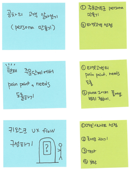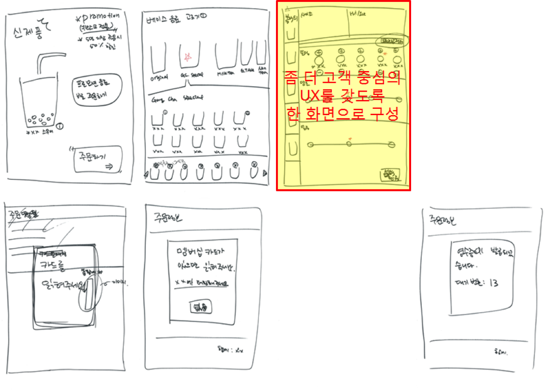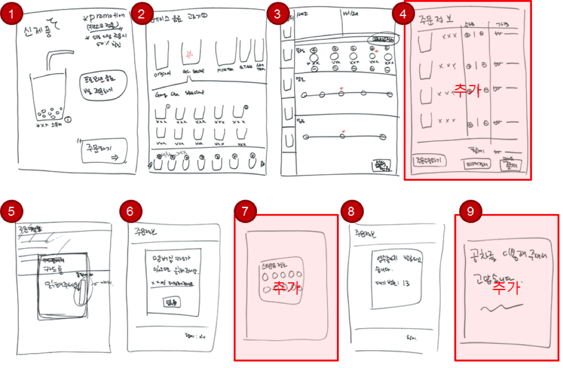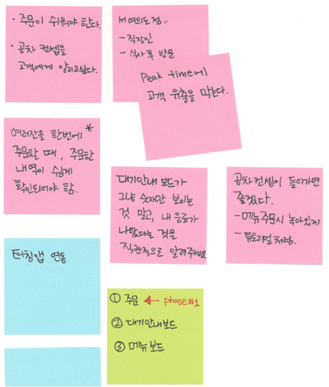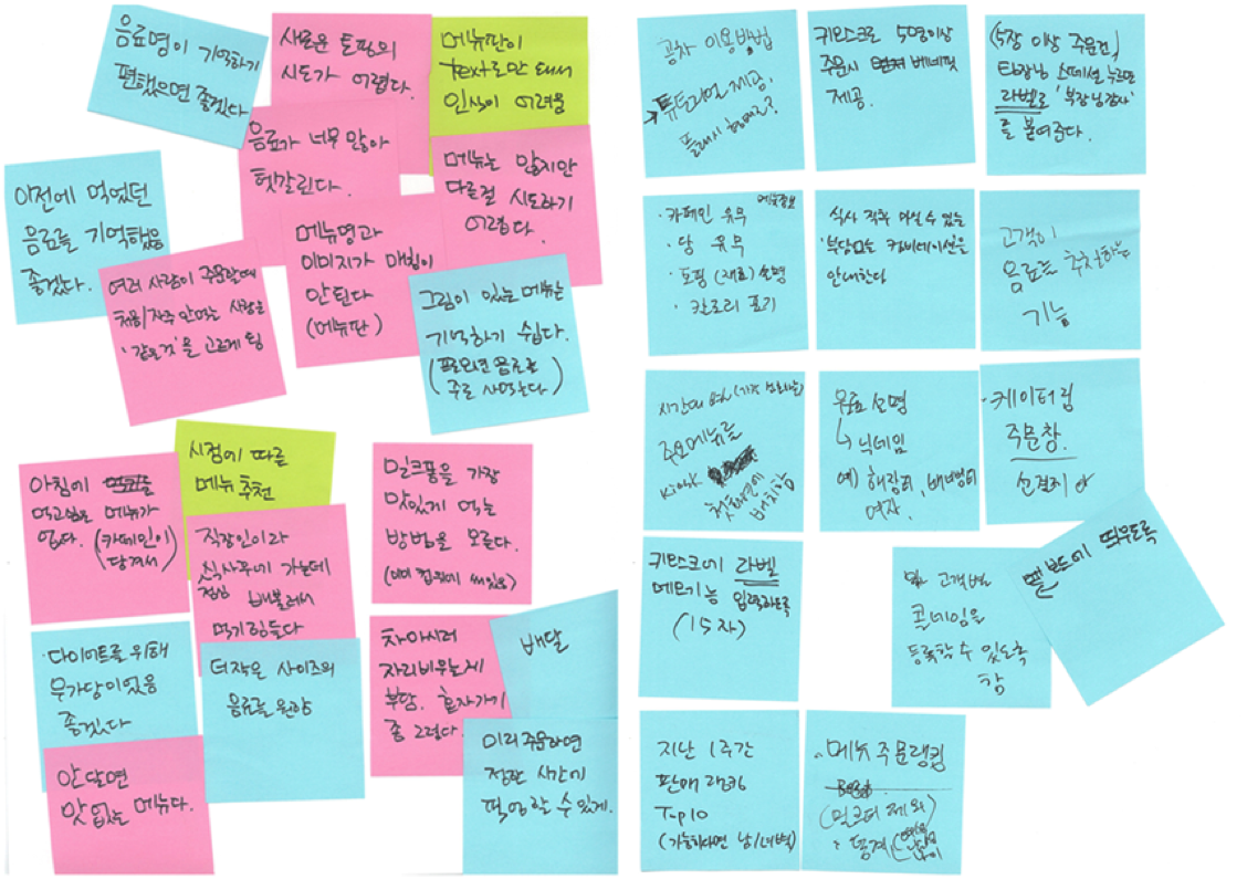 이번엔 매장에서 일해본 직원이 참여함으로써 음료 구매 시에 주문을 어떻게 받고, 어떤 과정으로 포스에 입력하는지 일련의 과정을 자세히 알 수 있었습니다. 그 경험이 실제 사용자 시나리오 도출하면서 순서를 정할 때 정말 큰 도움이 되었습니다.