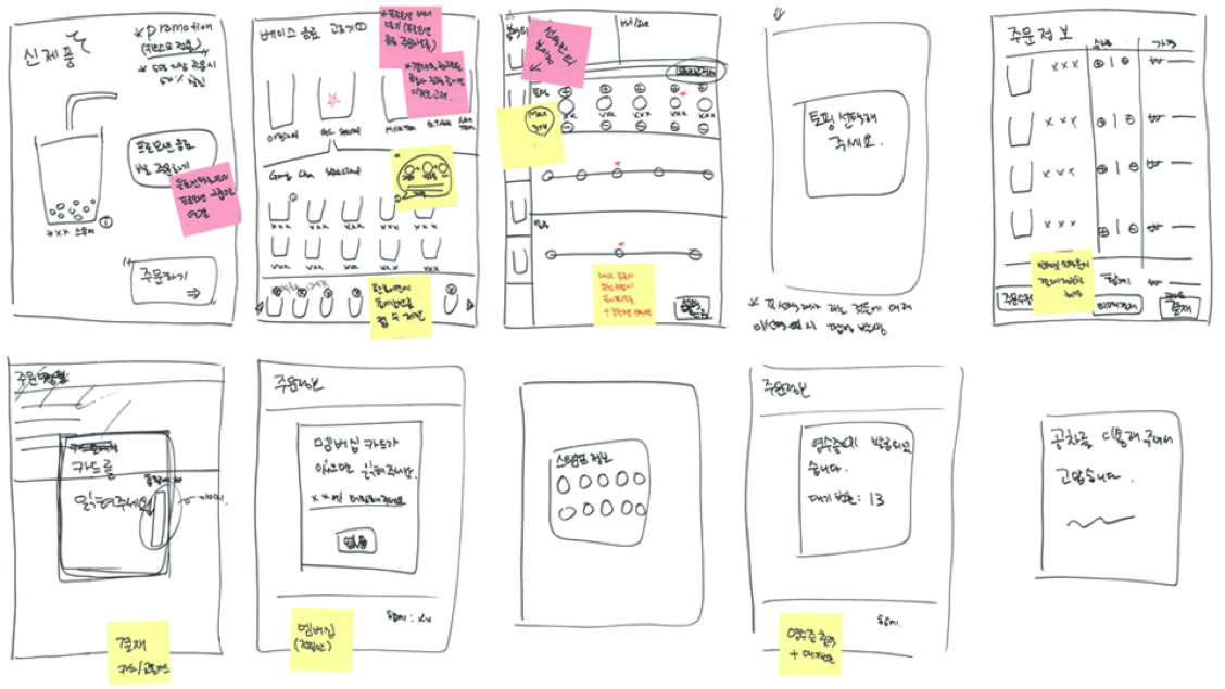 추가된 화면을 포함하여 실제로 키오스크로 주문하는 것처럼 다시 시뮬레이션합니다. 이 과정에서 새로이 추가할 내용과 뺄 내용을 포스트잇에 적어 각 화면에 붙입니다.