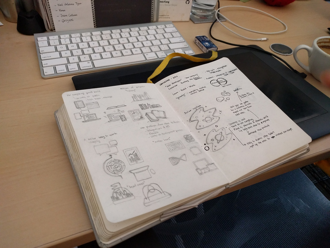 미진: 깃허브에서 디자이너로서 일하는 방식을 소개해주실 수 있어요? 아이디어를 내서 디자인하고, 그걸 최종 의사결정 받는 단계까지요. 디자인할 때 처음부터 컴퓨터에서 프로그램을 써서 그림을 예쁘게 만드는 작업보다는 종이에 스케치를 먼저 할 텐데, 깃허브에서는 어떻게 하는지 궁금해요.