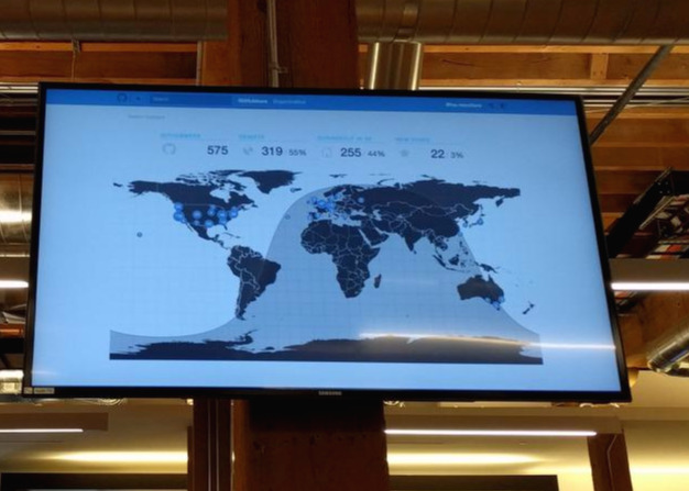 제임스: 워낙 리모트로 일하는 분들이 많으니까 어디에 몇 명 있는지 보여주는 거예요. 마지막으로 체크인한 정보가 나오는 것이라서 여행 가서 일하면 그 장소가 찍혀요. 한국에서 근무하시는 분은 없는데, 아마 여행 가셨나 봐요. 지난 주말에 유럽에서 GitHub Satellite 행사를 해서 지금 유럽에 사람들이 많이 있어요.