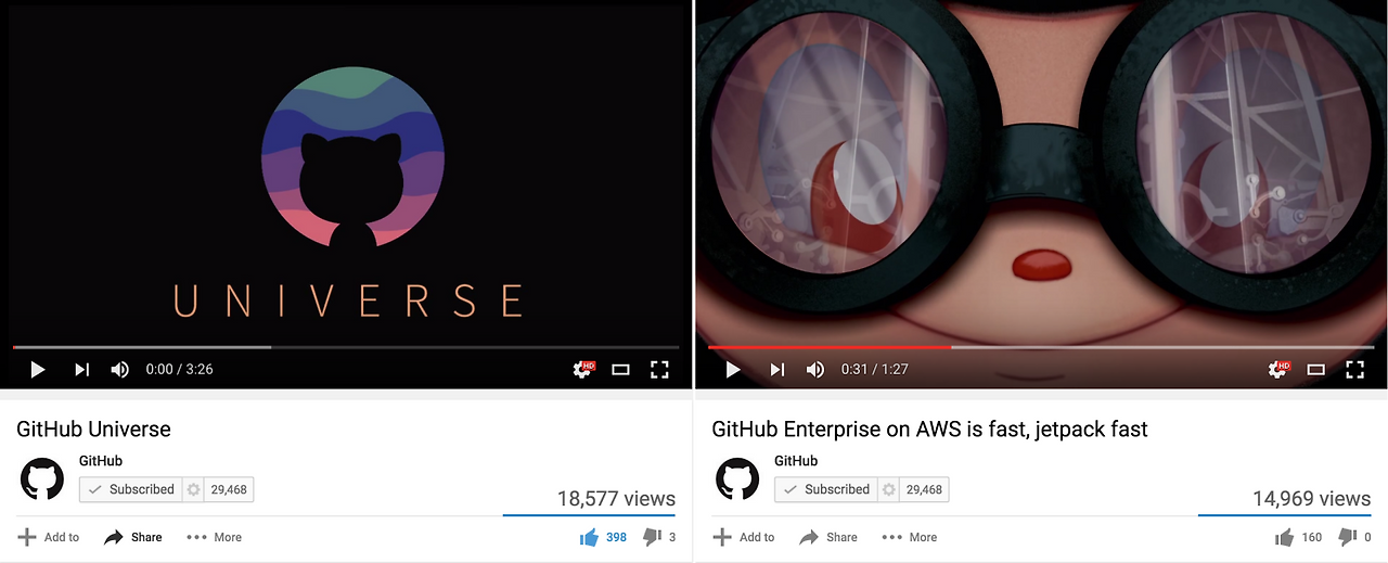 제임스: 깃허브 유투브(GitHub Youtube)에 가보시면 애니메이션이 두 개 있어요. 하나는 아마존웹서비스(AWS: Amazon Web Service)에 깃허브 엔터프라이즈(GitHub Enterprise)를 런칭할 때 만든 젯팩(jetpack)이고, 일주일에 한 번씩 진행되는 유니버스 컨퍼런스(Universe conference) 할 때 띄우는 애니메이션이에요.
