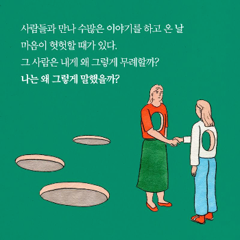 인간관계는 시소게임이나 스파링같아서, 체급의 차이가 크면 게임을 계속할 수 없다. 한두 번은 어느 한쪽이 일방적으로 져줄 수는 있겠지만, 배려하는 쪽도 받는 쪽도 금방 지칠 뿐이다. 인간관계를 지속하는 요건으로 '착함'을 드는 사람에게 그건 지속 가능하지도 않고 건강할 수도 없다고, 예전 내 모습이었던 착한 사람들에게 말해주고 싶다. 어느 한쪽이 착해야만 유지되는 관계라면, 그 관계는 사실 없어도 상관없는 '시시한' 것 아닐까? 건강한 인간관계는 시소를 타듯 서로를 배려하며 영향을 주고받을 때 맺어진다.