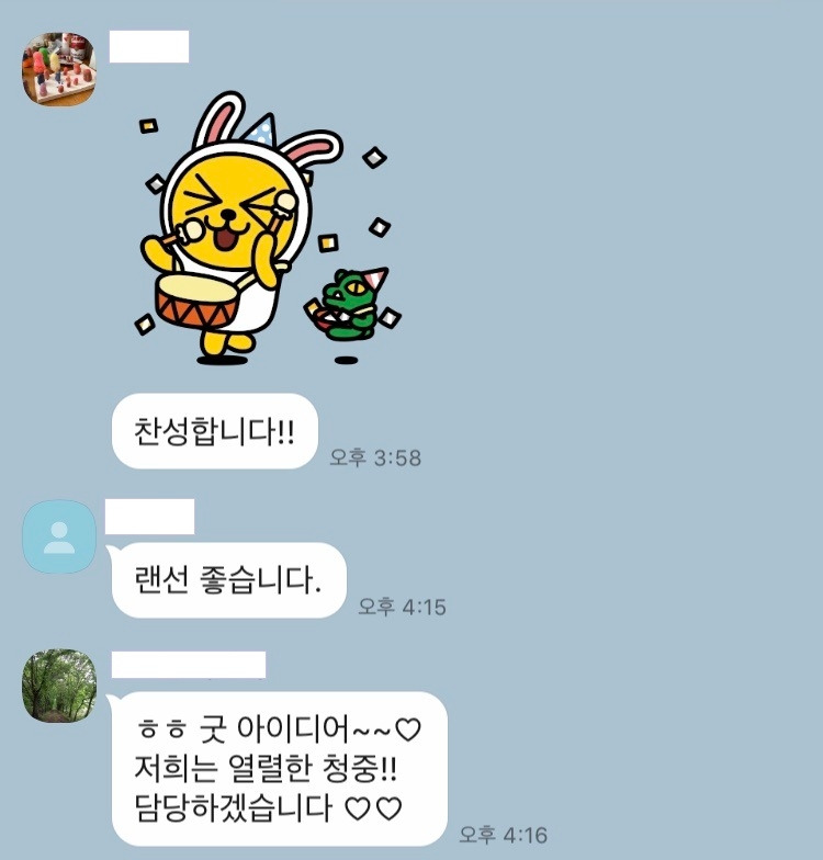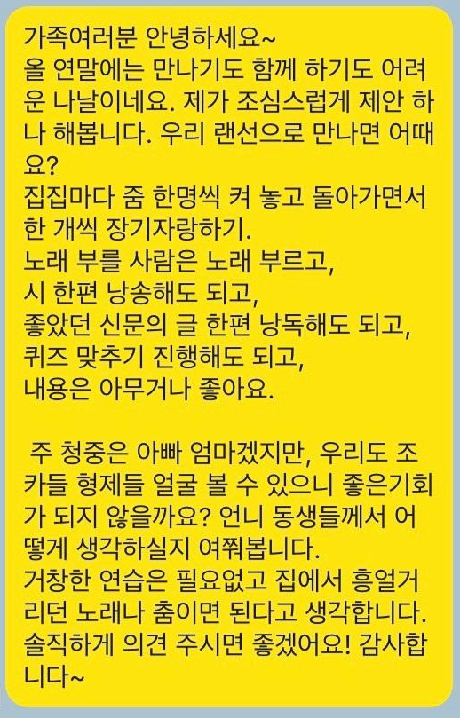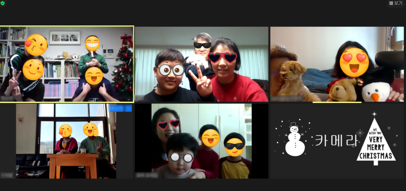 모임방을 해체하기 전에 “다 같이 멋진 모습으로 화면을 봐주세요.” 하며 단체사진을 찍었는데, 빨간색과 초록색의 드레스코드를 지킨 가족들, 음료수를 미리 준비해 파티를 즐긴 가족, V를 그리며 웃는 가족, 강아지를 안고 있는 모습을 다 담았다.