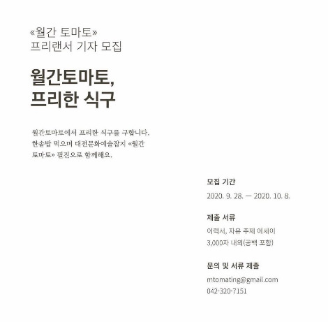 대전문화예술잡지 월간 토마토에서 기자를 찾는 것이었다. 이 잡지에 실린 글은 작가의 생각과 감상이 담긴 에세이 같기도 하고 정보 전달을 위한 기사 같기도 하다. 누가 이런 장르를 어떻게 쓰는 것인지 평소 궁금했는데, 잡지사 기자가 이런 일을 하는 거구나 하는 생각이 들었다. 한 번 지원해보고 싶었다. 프로젝트를 풀타임으로 수행하기는 어렵지만, 필요할 때만 모이는 느슨한 공동체 활동은 할 수 있을 것 같았다. 명절 내내 에세이를 쓰느라 끙끙댔는데, 얼마 후 오리엔테이션에 참석하라는 연락을 받았다.