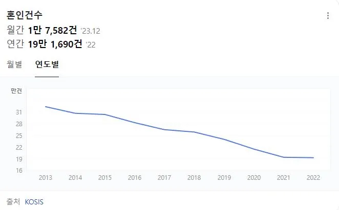 2013년도부터 2022년까지 한 번도 빠지지 않고 매년 혼인 건수가 줄이 들고 있는 통계자료를 보게 됐다.