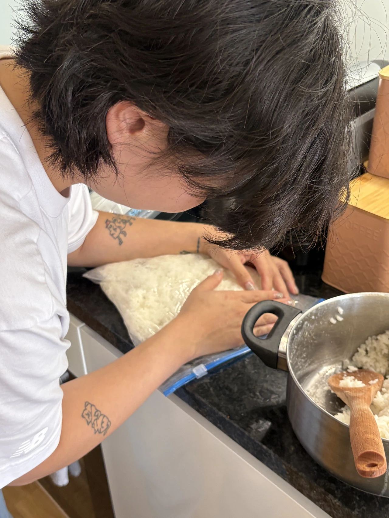 물이 끓어오르고, 단단한 쌀알들이 부드럽게 부풀어 오르며 그 양은 어마무시하게 거대해졌다. 어디까지 차오르는 건지 감도 오지 않았다. 부디 넘치지만 않기를, 속으로 빌었고 내 기도는 간신히 먹혀들어갔다. 완성하고 보니 그래도 먹음직스러워 보였다. 그마저도 잠시, 주걱 같은 숟가락으로 한술 뜨자마자 직감했다. 질다. 질어도 무지하게 질다. 주먹으로 몇 번 치면 곧 백설기로 변신할 것만 같았다. 분명 물 양도 잘 맞췄는데! 억울하기 짝이 없었다. 식으면 좀 괜찮아질 성싶어 냄비가 미적지근해질 때까지 인내의 시간을 가졌지만 결국 별반 다르지 않았다. 락앤락도 없어서 우선 지퍼백에 밥을 차곡차곡 소분했다. 무려 3팩이 나왔다.