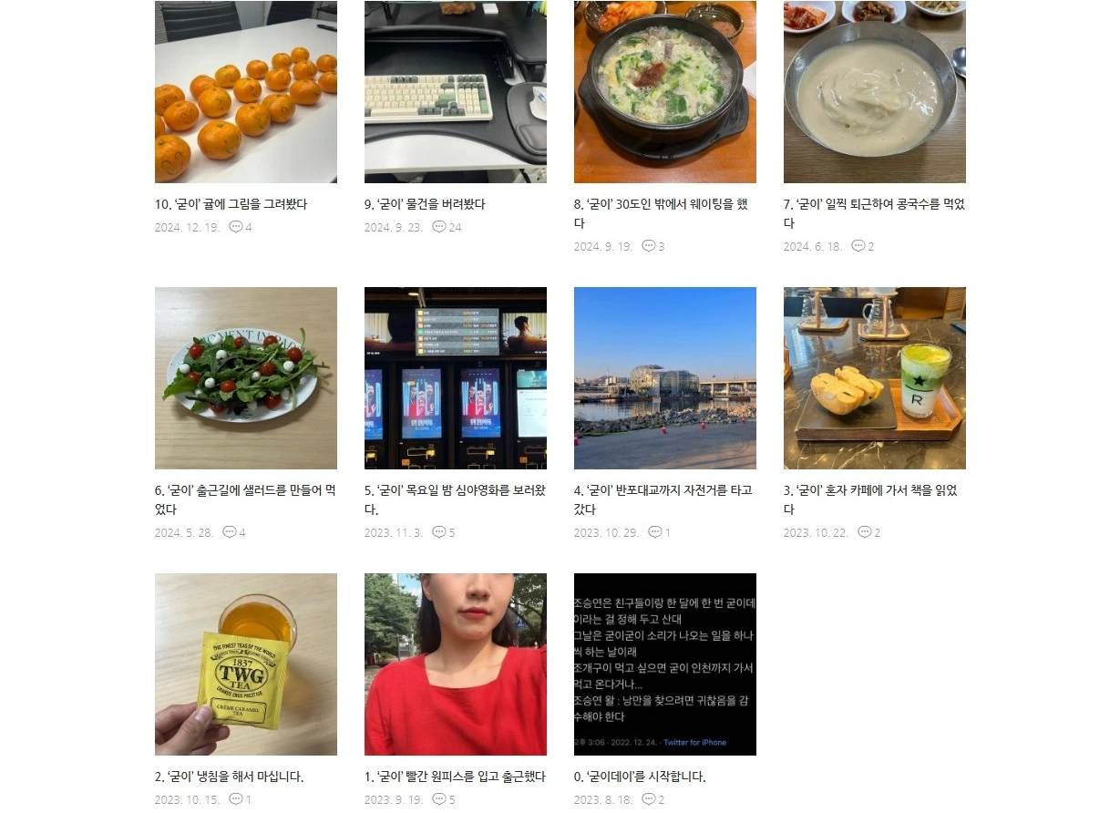 2023년 가을에 시작한 굳이데이가 벌써 10회를 맞이했다. 한때 MZ사이에서 낭만을 위해 '굳이'하는 날을 정해 무언가 하는 게 유행했는데 (나도 MZ이긴 하지만...) 신기해 보여서 나도 동참했다. 올해는 재단 내 사이드프로젝트도 진행하는 썬데이파밍클럽 멤버들이 농사지은 루꼴라로 샐러드를 해 먹고, 연말에는 회사 사람들에게 귤에 그림을 그려서 나눠줬다. 이런 순간들이 삶을 더 풍요롭게 만드는 것 같다.