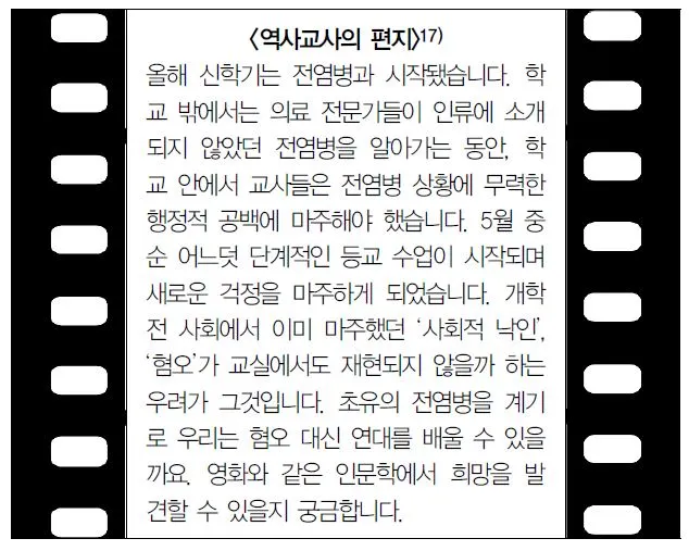 선생님들의 편지를 띄워주세요!! : 역사수업과 관련된 고민들 중 영화라는 매체를 통해 고민되는 지점들이나 질문을 편지 형태로 띄워주세요. 영화평론가 '최은' 님의 밀도 높은 답장을 받아보실 수 있게됩니다^^ <역사교사를 위한 영화수업>는 그런 코너입니다.