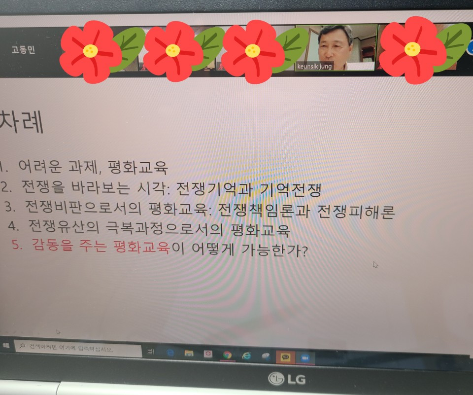 작년에 신규로 처음 발령을 받고 익숙하지 않은 업무에 치이고 하루살이처럼 하루하루 수업 준비에 매달리며 정신없는 일 년을 보냈다. 나름 아이들에게 의미 있는 역사교육을 하고 싶다는 사명감을 가지고 교직에 들어왔지만 일 년간의 수업은 그저 지식전달에 머물렀을 뿐 학생들에게 울림을 줄 수 있는 수업은 단 한 번도 하지 못했다는 부끄러운 생각이 들었다. 올해는 학생들에게 의미를 남겨줄 수 있는 수업을 하고 싶다는 막연한 생각을 하고 있던 차에 전국역사교사모임에서 한국전쟁 연수를 한다는 소식을 들었다. 올해는 한국전쟁 70주년이기도 하고 전쟁을 통한 평화교육은 어떻게 할 수 있을까 하는 궁금증이 생겼다. 또한, 평소 제주 4·3을 통한 평화교육 실현 방안을 고민하고 있었는데 이번 연수가 평화교육 실현 방안에 힌트를 제공해 줄 수 있지 않을까 하는 생각이 들어 신청하게 되었다. 코로나-19의 확산으로 아쉽게도 현장 연수는 진행하지 못하고 온라인 ‘줌(zoom)’을 활용해 연수를 진행했지만, 연수에 참여한 선생님들의 눈빛은 누구보다 빛났다. 연수 기간 진행된 좋은 선생님들의 강의, 그 후에 이어진 질문과 토론은 인식의 지평을 넓혀주고 생각의 깊이를 더해줄 수 있는 시간이었다.