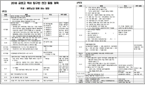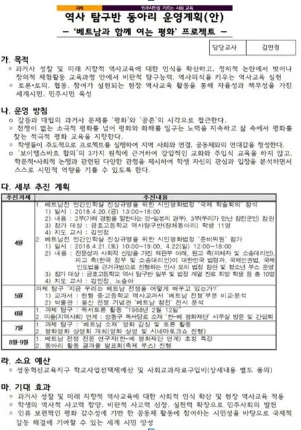 이러면 안 되겠다 싶어 2018학년도 동아리 모집 때는 ‘베트남 전쟁에 대한 공부를 1년 내내 할 것이고 아주 열심히 해야 한다.’라고 겁을 줬다. 그 결과 공부할 각오가 되어있는 적극적인 친구들만 왔고 소수정예(1학년 6명, 2학년 5명) 동아리가 되었다. 학생들에게 어떤 활동을 하고 싶은지 묻고, 관련 자료를 찾게 한 다음 동아리 운영 연간 계획을 짰다. 1년에 하나씩 활동 주제를 선정하여 역사 동아리를 운영하신 모임의 정희연 선생님 사례가 큰 도움이 되었다.