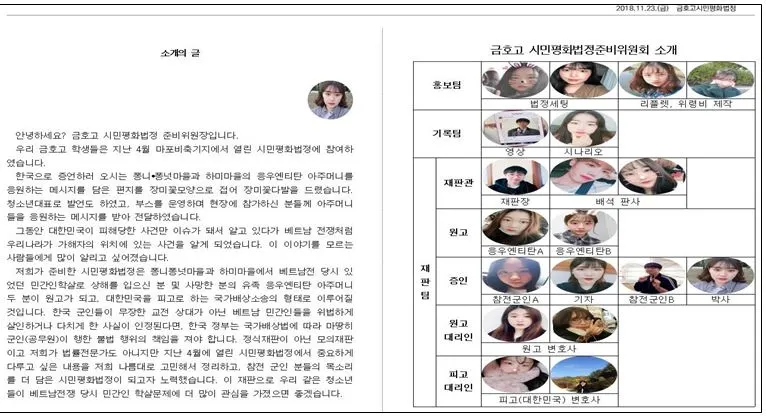 나는 금호고 시민평화법정을 진행하기 전에 베트남 전쟁에 대해 아무것도 알지 못했다. 한국군이 참전한 사실도 모르고 있었다. 그래서 한국군이 베트남 민간인 학살을 일으켰다는 것을 들었을 때 굉장히 많이 놀랐다. 나는 항상 대한민국이 다른 국가에게 피해를 당했던 사건들만 배워 와서 한국군 민간인 학살 사건은 충격적이고 새롭게 다가왔다. 피해자들의 피해 정도가 굉장히 심각한데 대한민국이 이에 대해 공식적인 사과를 하지 않았다는 것을 알고 당황스러웠다. 어서 빨리 사과를 했으면 좋겠다. – 금호고 2학년 송○○