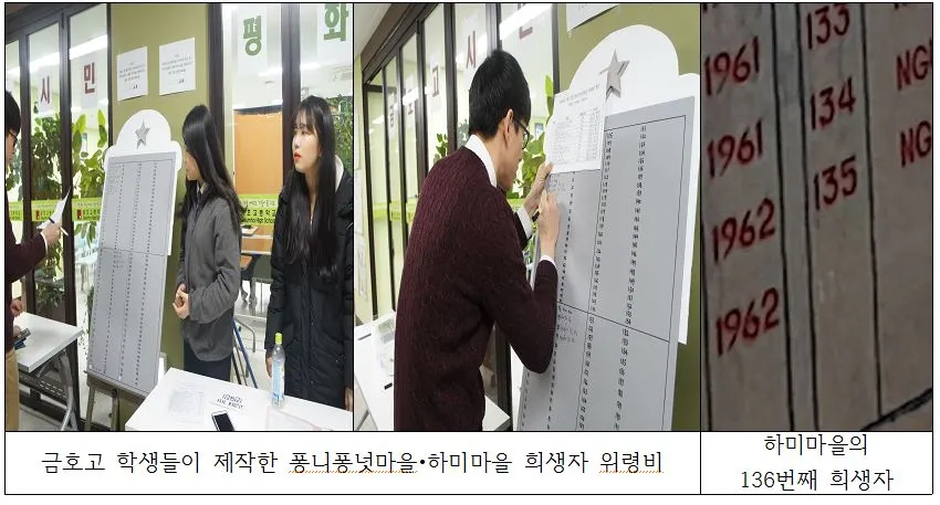‘위안부’ 문제를 알리는 평화의 소녀상이 있다면 베트남 전쟁의 학살을 기억하는 조형물은 제주 강정 평화센터에 있는 ‘베트남 피에타상’이다. 학생들에게 이 문제를 널리 알리기 위하여 모금을 하고 학교에 베트남 피에타상의 미니어처라도 세워볼까? 배지를 만들까? 여러 가지 생각을 했다. 배지 디자인을 공모할 시간이 많지 않았고 조금 더 시간을 들여 제대로 하고 싶었다. 피에타상의 미니어쳐도 좋지만 우리 학교에만 있는! 학생들이 직접 창작한! 기념물을 만들고 싶었다. 그래서 아이들과 회의 끝에 폼보드에 퐁니-퐁넛마을과 하미마을의 희생자의 이름을 태어난 연도와 함께 적어보는 위령비를 만들었다. 두 학살 모두 1968년에 일어났는데 희생자가 태어난 연도 역시 1968년에서 그리 멀지 않다. 그 의미는 막 태어나거나 나이가 어린 희생자가 많았다는 것이다.
